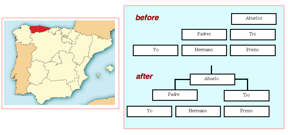 79.18 Chart 275 was said to be the kinship terms of the Asturian language…altho it is in fact written in Spanish. I present it here as I found it, with 2 changes…the founding anscetor of each “cousin line” has been moved over and connected downward…as seen above on the right…on the left is a map showing the location of the what is today the Spanish provence of Asturias.